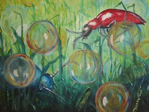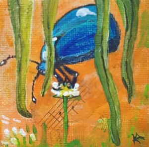 2016Twee kevers dwalen door gras. Schilderij, mixed media.