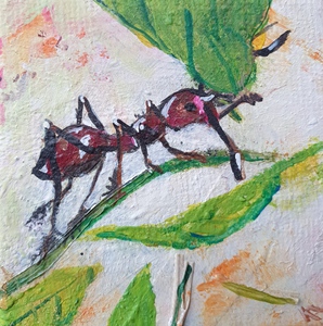 2016Parasolmier met groen blad. Miniatuurschilderij