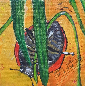 2016Parasolmier met gekleurd stuk blad. Miniatuurschilderij.