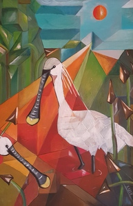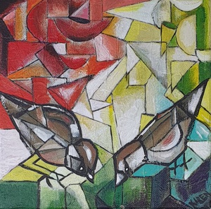 Vogels op doek, kleurrijk met kubistische inslag