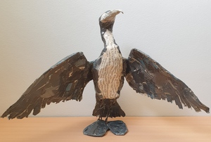 2018Aalscholver laat vleugels drogen. Papier maché van krantenpapier, met poten van zachtgegloeid staaldraad. Geen verf gebruikt.